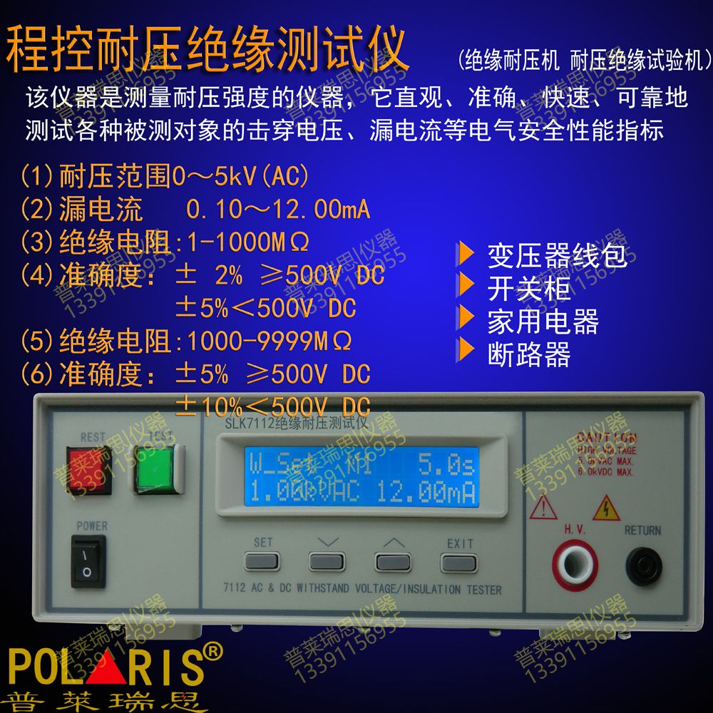适用于家用电器、电源开关、电线电缆、变压器、接线端子、高压胶木电器、电机、医疗、化工、仪器仪表 (1)耐压范围0~5kV(AC) (2)漏电流 0.10~12.00mA (3)绝缘电阻:1-1000MΩ (4)准确度:±