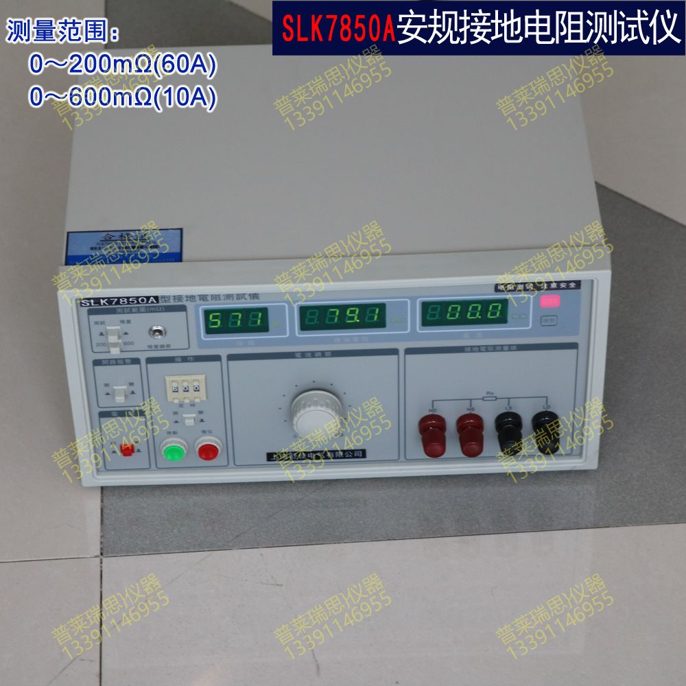SLK7850A 系列接地电阻测试仪是按照 GB﹑IEC﹑ISO﹑BS﹑UL﹑JIS 等国际国内的安全标准而设计的,接地电阻的指标是衡量各种电气设备安全性能的重要指标之一。它是在大电流(25A 或 10A)的情况下对接地回路的电阻进行测量,同时也是对接地回路承受大电流指标的测试,以避免在绝缘性能下降(或损坏)时对人身的伤害。本测试仪是为满足以上要求为生产车间及实验部门提供高性能测试仪器而开发生产的。本仪器对供电电压要求不高,测量精度高,速度快,使用方便,特别适用于要求高的实验室和自动检测线上使用。断路报警选择功能(即开路报警)可以方便地知道仪器是否工作在正常测试状态,用户可以根据实际需要选择是否需要此项功能。本仪器采用三位半数字显示, 读数方便,采用优化设计,整机具有极高的可靠性和稳定性。